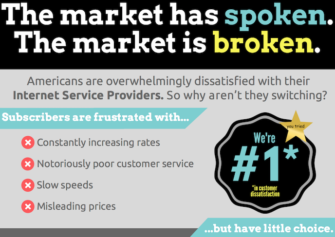 At the Institute for Local Self-Reliance, where we work to support local economies, this broken market is a major problem. Cable monopolies are bad for local businesses, which become less competitive from paying too much for unreliable Internet access. Communities cannot thrive without high quality Internet access today.