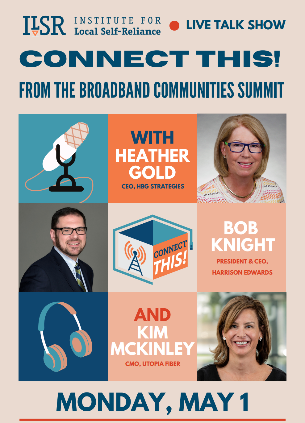 Join us Monday, May 1st at 8pm ET for another special live episode of the Connect This! Show, from Broadband Communities Summit in The Woodlands, Texas. Christopher Mitchell (ILSR) will be joined by Kim McKinley (UTOPIA Fiber), Heather Gold (HBG Strategies) and Bob Knight (Harrison Edwards) at the conference's welcome reception. They'll tackle the question of how we can actually get affordable, reliable, fast Internet for all to every household in America, from the perspective of the American Association for Public Broadband. They'll also discuss the latest news in municipal broadband, with a spotlight on Yellowstone Fiber in Bozeman, Montana, and how it could serve as a model for communities in states with preemption laws or which face financial challenges.