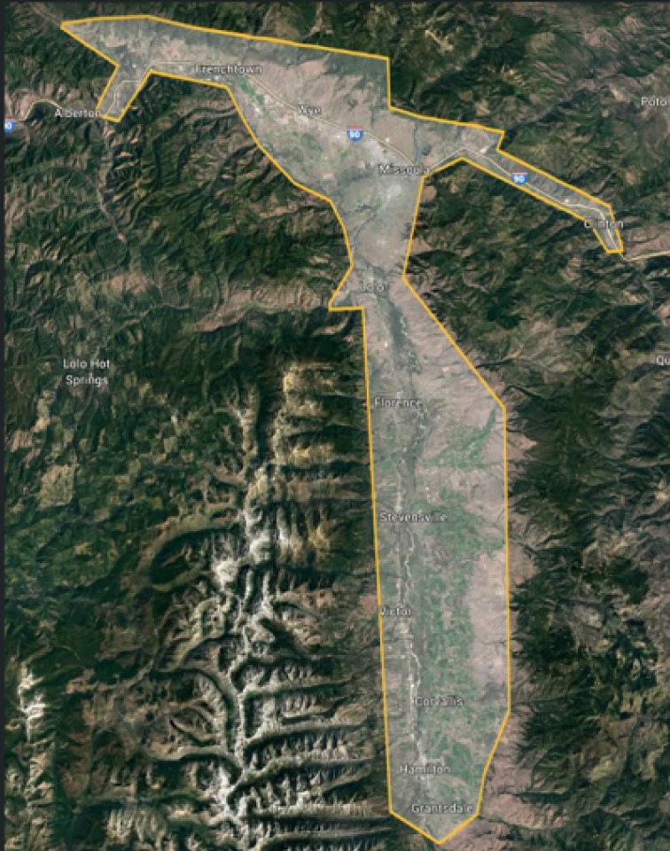 At present, the Missoula Valley Internet Cooperative covers Missoula’s (pop. 74,000) Grant Creek neighborhood, a roughly one and a half square-mile area (see right) of 400 households bounded by the Clark Fork River and Highway 90. But the eventual plan is to cover all of Missoula before expanding to cover East Missoula, Bonner, and Clinton, and then head south toward Lolo. The total proposed coverage area (see below) is reminiscent of the shape of the state of Florida, about 30 miles wide and 50 miles long, with the city of Missoula at the northeast corner and including the cities and towns along the T-shape made by Interstate 90 and State Highway 93.