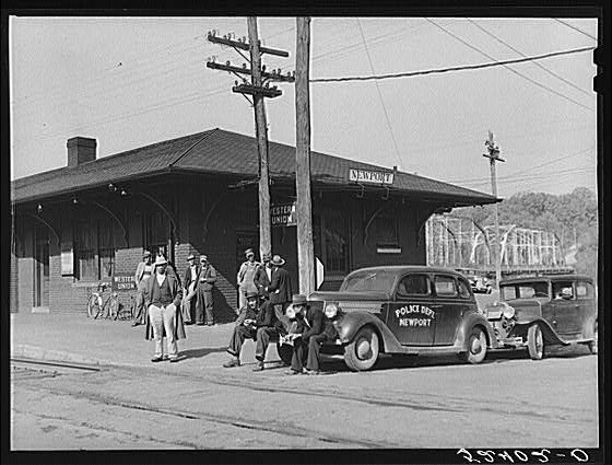Old photo of men at Newport station courtesy of Marion Post Wolcott [Public domain], via Wikimedia Commons.