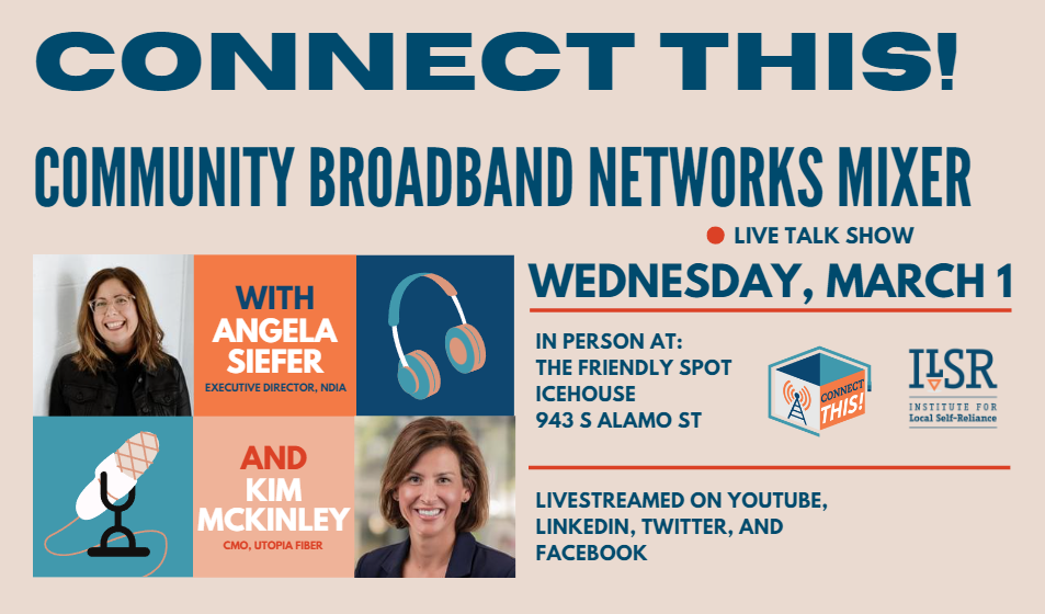 Join us on Wednesday, March 1st at 7:30pm ET for a very special episode of the show, live from Net Inclusion 2023 in San Antonio, Texas. Christopher Mitchell (ILSR) will be joined by Kim McKinley (UTOPIA Fiber), Angela Siefer (National Digital Inclusion Alliance), Autumn Evans (City of Detroit), and ILSR's DeAnne Cuellar, and in front of a live audience at The Friendly Spot Icehouse. They'll talk pilot projects to reach neighborhoods long left behind by the monopoly marketplace, how to overcome stubborn digital equity and inclusion challenges, what it takes for cities to make forward-thinking, bold choices for better local Internet infrastructure, mobilizing local elected officials as an interested citizen, and much more. We expect a large audience and have a revolving seat for questions, comments, and jokes at Chris' expense. Join us!