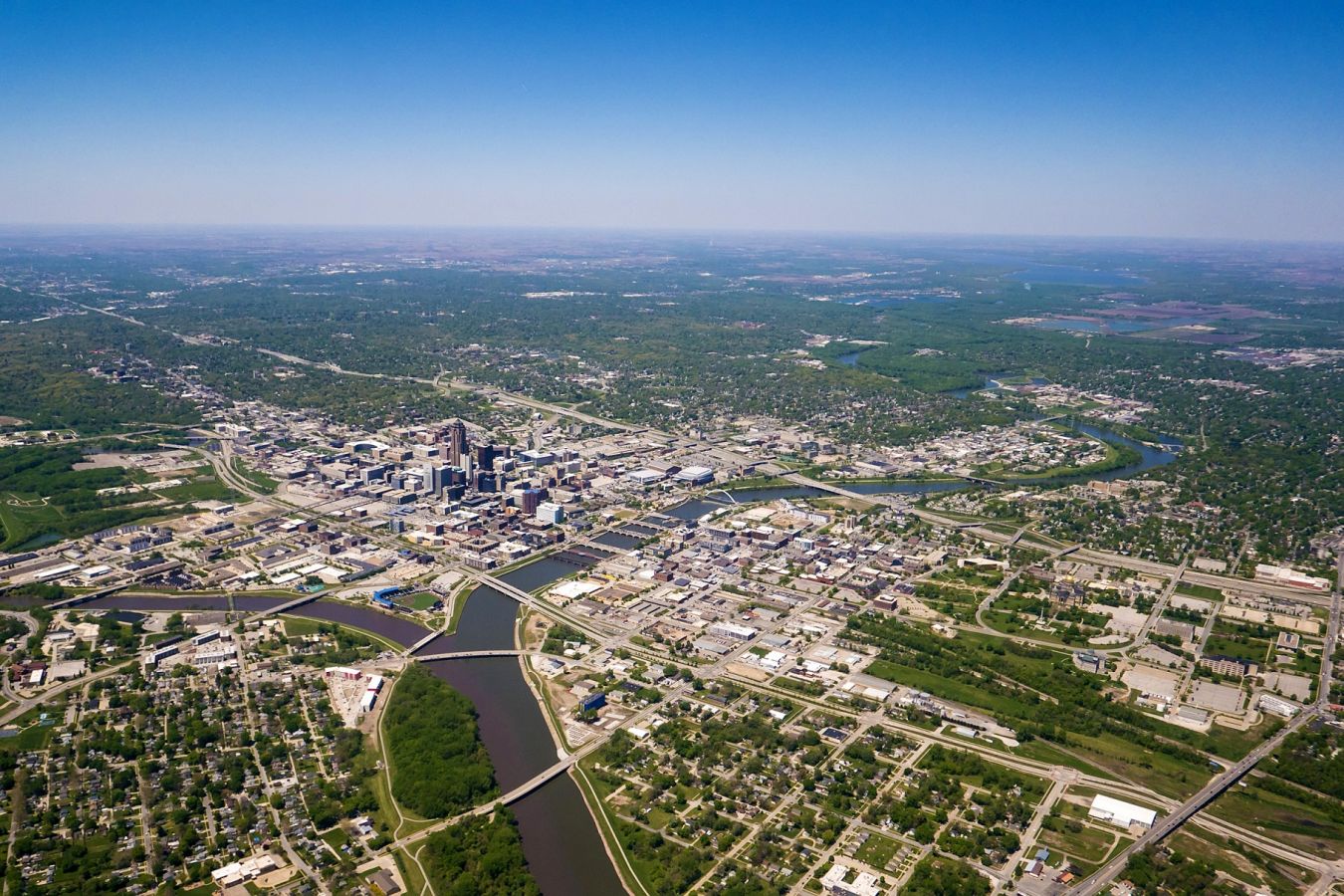 Aerial photo of Des Moines, Iowa from 10,000 feet May 6, 2017. USDA photo by Preston Keres licensed under Creative Commons Attribution-Share Alike 3.0 Unported license.