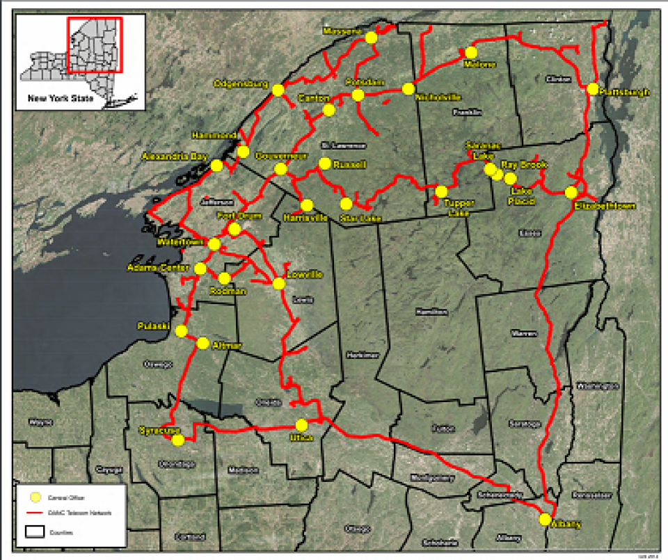 The DANC was established in 1985 as a public benefit corporation, initially to support operations at Fort Drum. Today, it runs a landfill for three counties, a wastewater division, and operates a regional water line in addition to an open access fiber network around 1,800 miles long. Called the Open Access Telecom Network (see map below), it was begun in 2003 and today serves a host of business and institutional partners in upstate New York. This includes two large medical networks consisting of around 100 facilities (including in Tupper Lake), almost every school in the North Country, most of the municipal services, and other businesses.