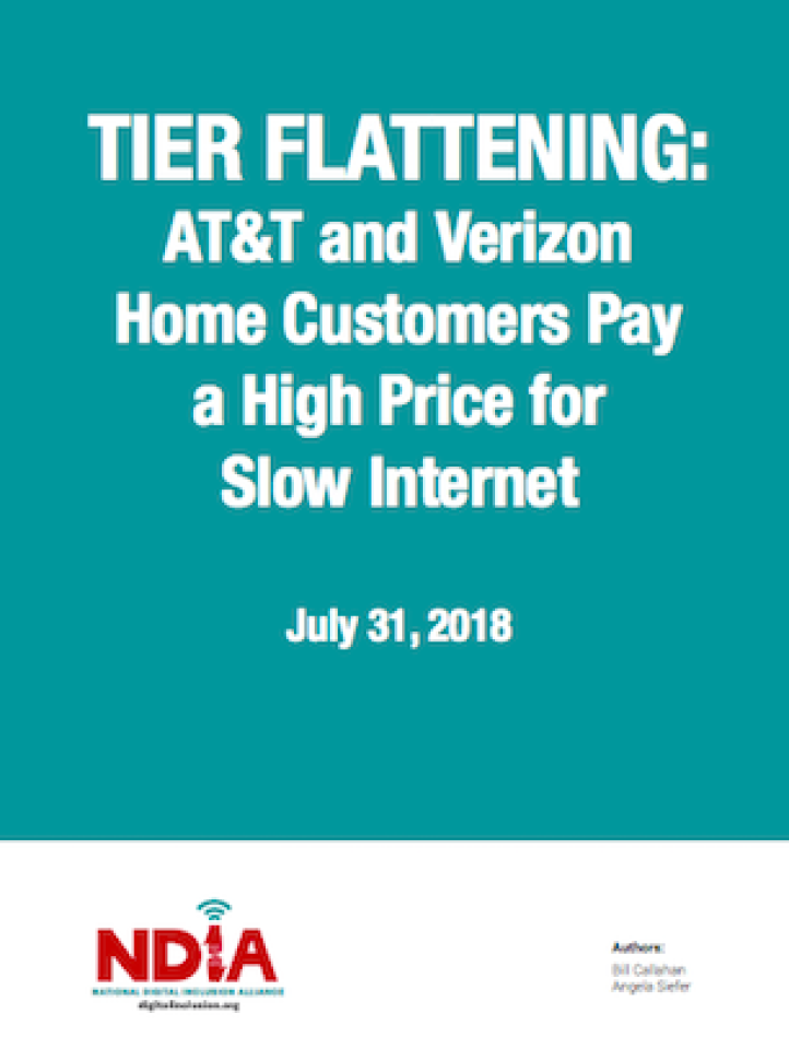 This report from the National Digital Inclusion Alliance (NDIA) takes a detailed look at tier flattening from AT&T and Verizon, digging into monthly rates that users pay and the types of services they obtain from each company. The authors put the numbers side by side and show that those purchasing what used to be the most economical Internet access service are now simply paying higher rates for slow service.