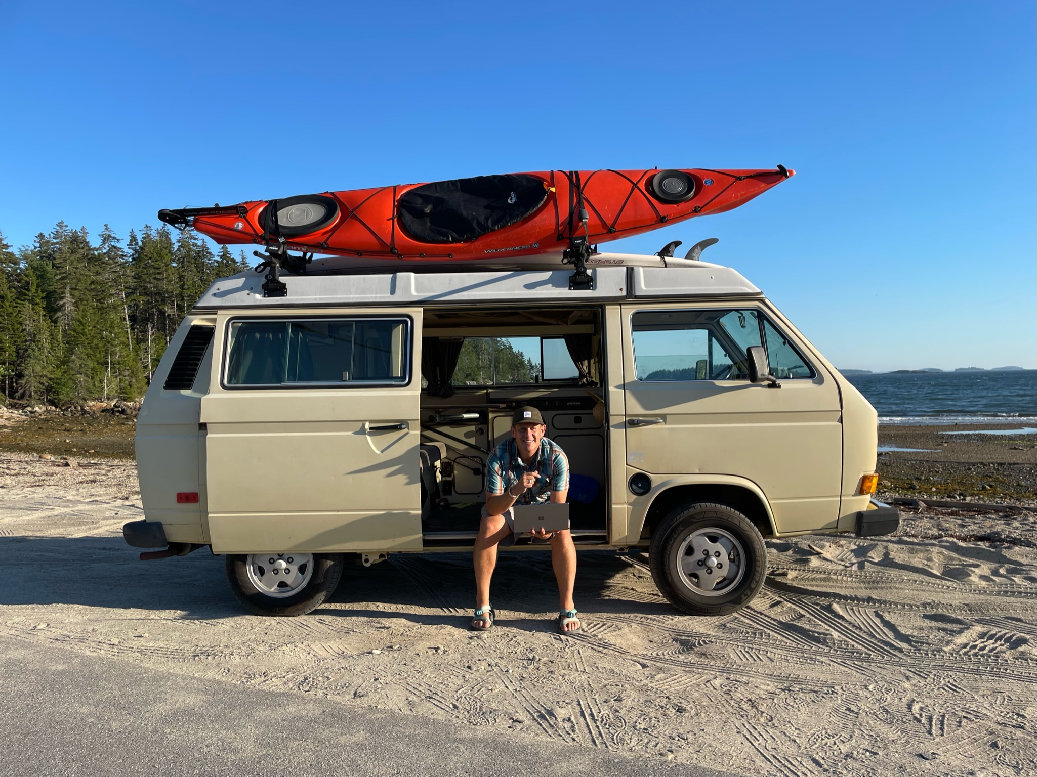 Header image of Andrew Butcher working on his laptop inside “Buttercup” courtesy of Andrew Butcher