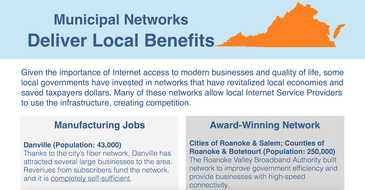 The latest addition to our list of fact sheets focuses on Virginia: Municipal Networks Deliver Local Benefits. We noticed that municipal networks in the “Mother of States” have spurred economic development, saved taxpayer dollars, and improved local connectivity.