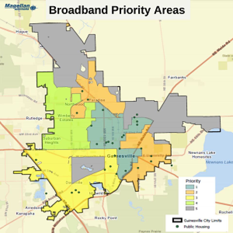 The playbook the city is using is the business plan developed by Magellan Advisors, who identified the downtown area - as well as neighborhoods in east and southeast Gainesville - as the “Priority 1 Area” for the start of a city-wide municipal fiber-to-the-home (FTTH) network. The map carves the city into “Broadband Priority Areas” with the end-goal of building out the network across five sections of the city, as funding becomes available.