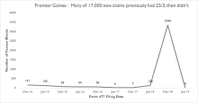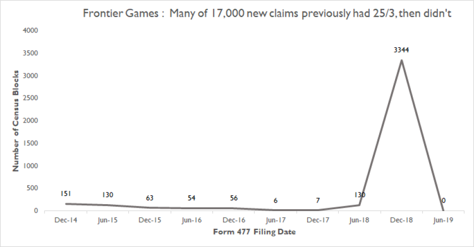 Frontier’s filings of broadband service within the 16,987 blocks is not consistent. In Form 477 filings from Dec 2014 - June 2019, only 3590 or 21% of these blocks were filed at least once as having broadband coverage from Frontier. 13,397 or 79% of census blocks filed on April 10, 2020 would have had to have broadband installed since June 2019.