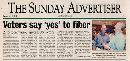 The July issue of the local Independent tells the story of the network. According to Terry Huval, Director of LUS Fiber, the self-reliant streak has always been part of Lafayette's culture - in 1996 the city celebrated its 100th year vote to create its own electric and water system. The Independent article describes that culture as it permeated the vision shared by City-Parish President Joey Durel and Huval.