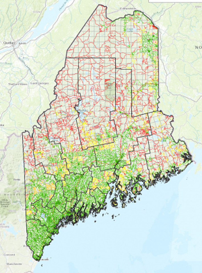 Inline Map of Maine’s Served, Underserved, and Unserved Areas, July 2020, courtesy of the Connect Maine Authority