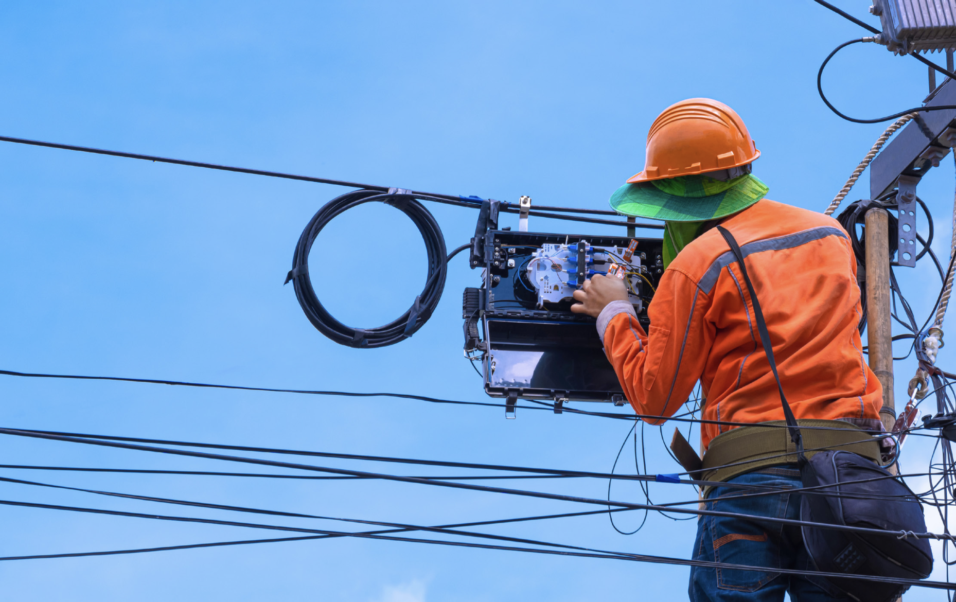 Header image of lineman working inside aerial fiber splice case courtesy of City of Oakland