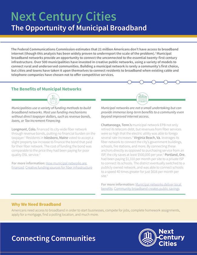 Next Century Cities (NCC) helps communities across the U.S. connect to each other, find resources, and discover ways to improve local Internet access options. The organization has released valuable tools and resources to that aim, including their most recent fact sheet, The Opportunity of Municipal Broadband.