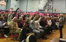Voters at the November 18th Town Meeting display pink cards that represent their approval of the Princeton Broadband project. (Thank you to Stan Moss for the photo.)