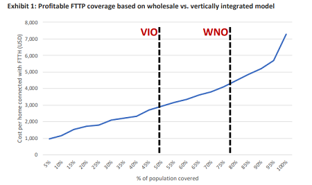 - Our analysis shows that a WNO [Wholesale] based model could cover close to 80% of US households with fiber to the premises whereas a VIO [Vertical] model could only reach 50% profitably