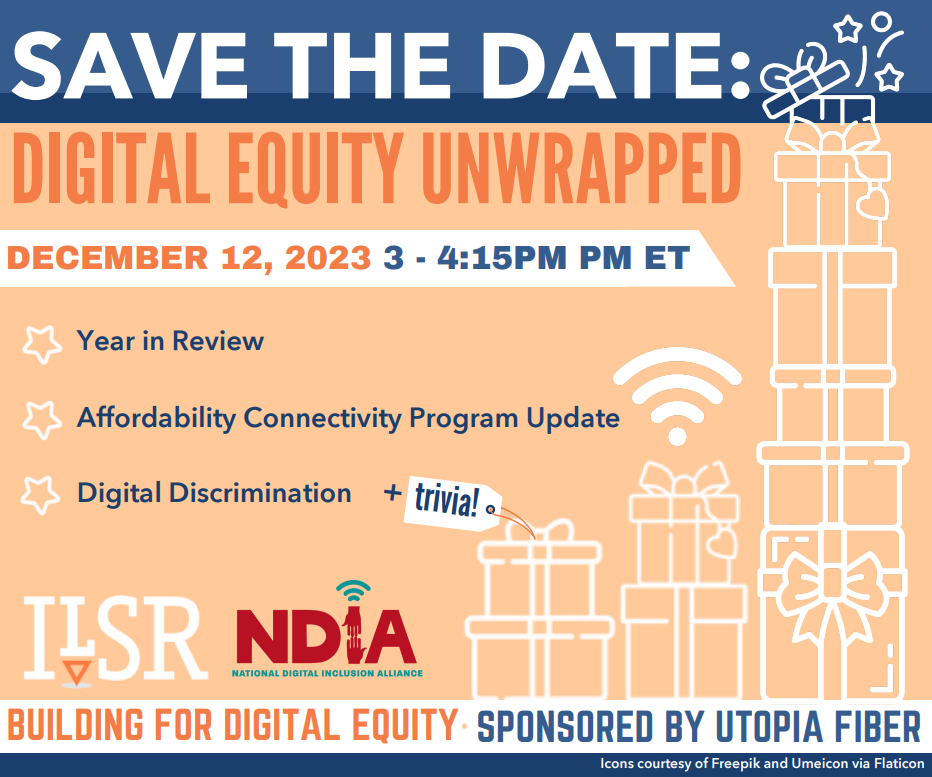With the holiday season upon us, the Institute for Local Self Reliance (ILSR) Community Broadband Networks Initiative and the National Digital Inclusion Alliance (NDIA) are gearing up for the final Building for Digital Equity (#B4DE) event of the year and encouraging digital equity practitioners to save the date.
