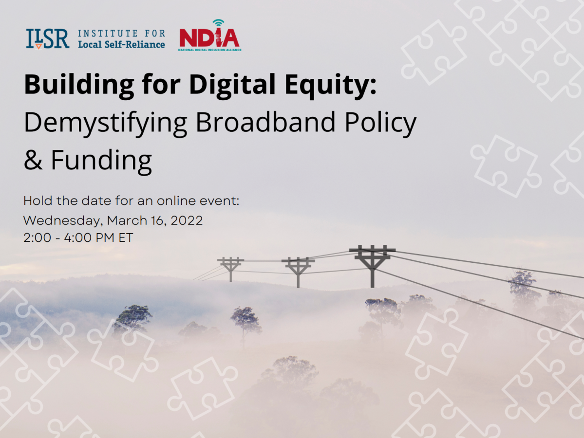 Last week we invited you to save the date for a two-hour livestream event Building for Digital Equity: Demystifying Broadband Policy and Funding that the Institute for Local Self-Reliance (ILSR) is co-organizing with the National Digital Inclusion Alliance (NDIA).