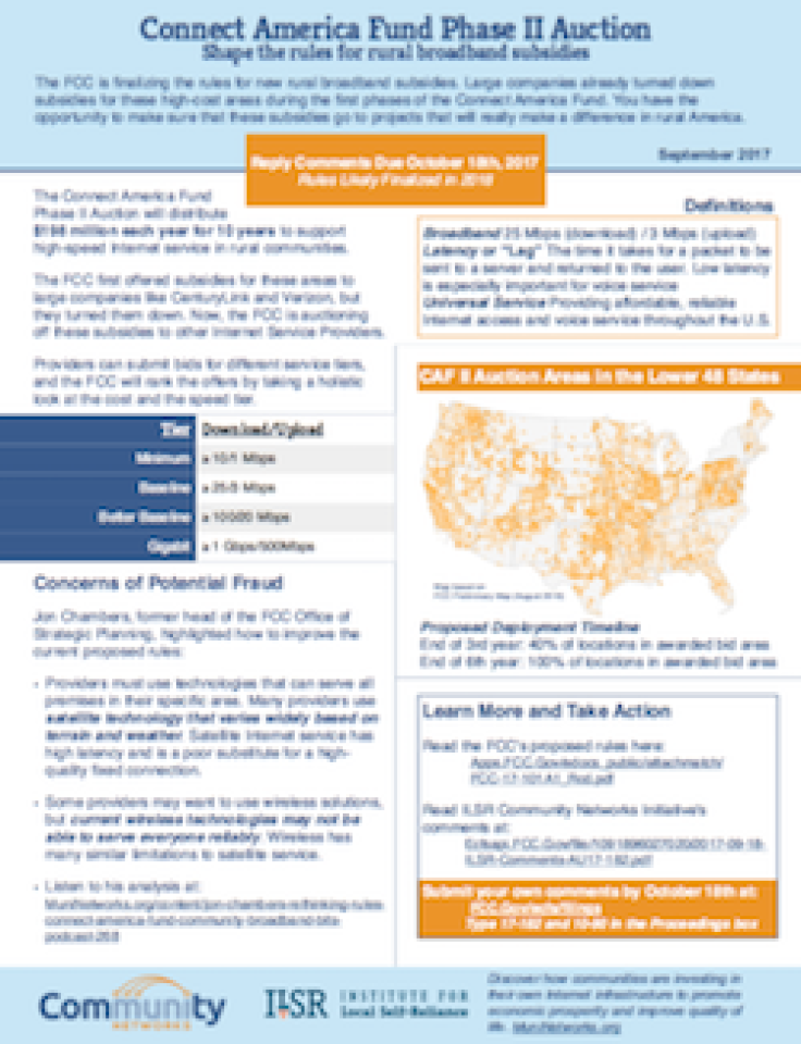 The Federal Communications Commission (FCC) manages the CAF program, which provides billions of dollars in subsidies to Internet service providers for areas where the cost of building networks is prohibitive. Some large providers decided not to accept some of the subsidies during Phase I - about $198 million annually for 10 years. This fact sheet details the most important aspects of the Connect America Fund (CAF) Auction. What is it? What should it do? Who does it affect?