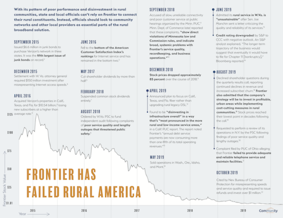 Despite raking in hundreds of millions in government broadband subsidies, Frontier Communications has failed time and time again to bring reliable, high-speed connectivity to the rural communities it serves. Instead of investing in network upgrades, Frontier has neglected its rural infrastructure to the detriment of its subscribers and the company’s own financials, with its worsening service quality paralleling its plummeting stock value. This fact sheet presents evidence of Frontier’s negligence and suggests that rather than continuing to trust Frontier, government officials should look to publicly owned and community-minded providers to connect rural residents, businesses, and institutions.