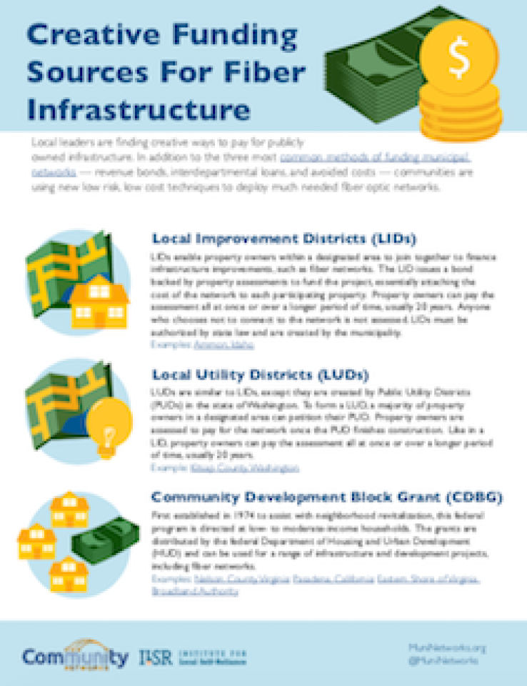 As interest in publicly owned broadband network infrastructure increases, local communities seek new ways to fund municipal networks. Revenue bonds, interdepartmental loans, and avoided costs have been the three most common methods for funding Internet network infrastructure, but local leaders are finding creative approaches to get the job done. In this fact sheet we analyze some new approaches to funding fiber optic infrastructure, pros and cons, and offer some examples.