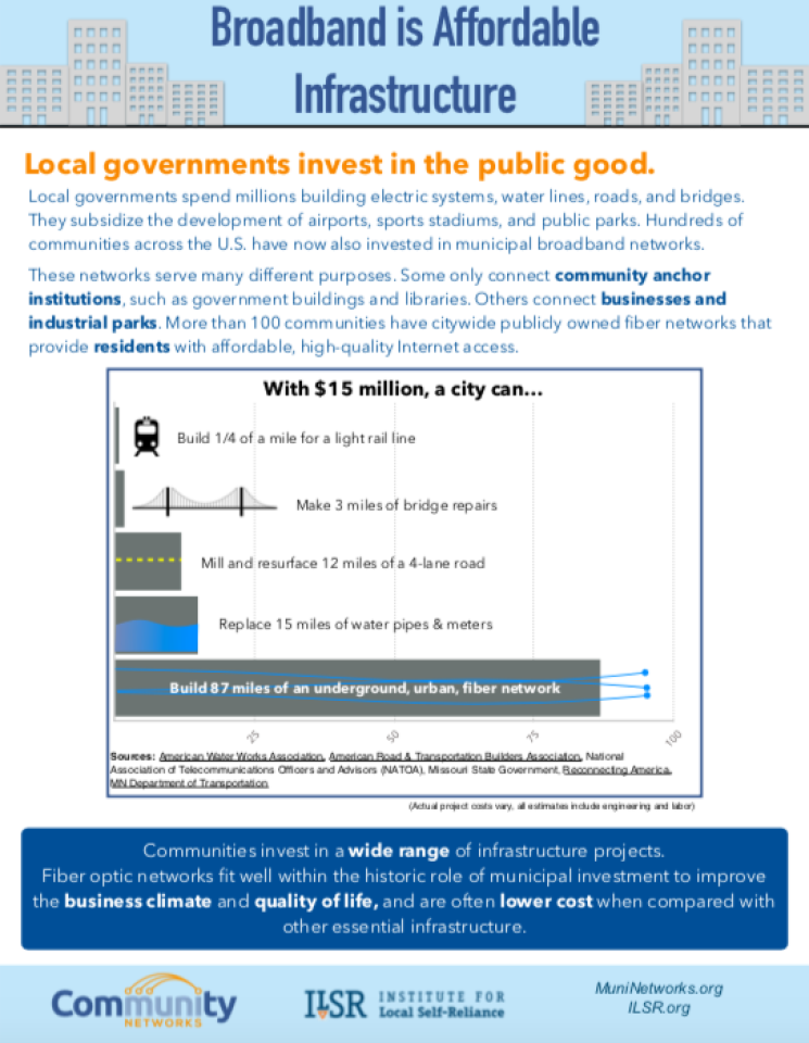 Local governments spend billions on all sorts of infrastructure every year to advance the public good for their communities. Roads and bridges keep day-to-day activity moving. Investments such as water and sewer infrastructure keep cities clean and livable. Fiber infrastructure is used for a wide range of purposes, including economic development, education, and to keep a city’s administration connected. To get a look at how fiber network infrastructure compares to other public investments, we've developed the Broadband is Affordable Infrastructure fact sheet.