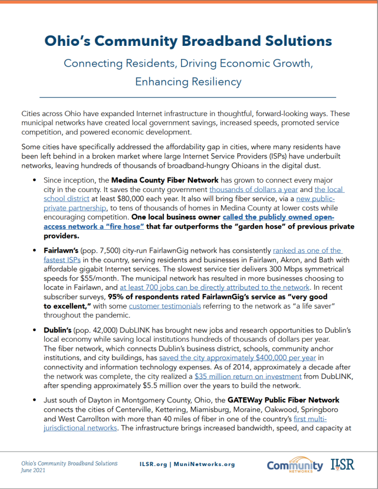 Cities across Ohio have expanded Internet infrastructure in thoughtful, forward-looking ways. These municipal networks have created local government savings, increased speeds, promoted service competition, and powered economic development. Some cities have specifically addressed the affordability gap in cities, where many residents have been left behind in a broken market where large Internet Service Providers (ISPs) have underbuilt networks, leaving hundreds of thousands of broadband-hungry Ohioans in the digital dust. This fact sheet outlines the many long-term benefits that municipal broadband projects have brought to the state.