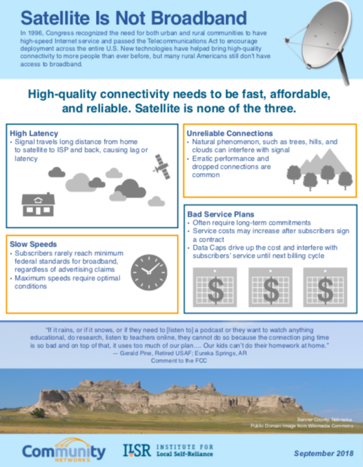 As a nation our goal is ubiquitous broadband coverage so every person, regardless of where they live, can obtain the fast, affordable, reliable Internet access necessary for modern times. For people in rural areas, where large national wireline providers don’t typically invest in the infrastructure for high-quality connectivity, satellite Internet access is often their only choice. In this fact sheet we address some of the reasons why depending on satellite Internet access to serve rural America is a mistake.