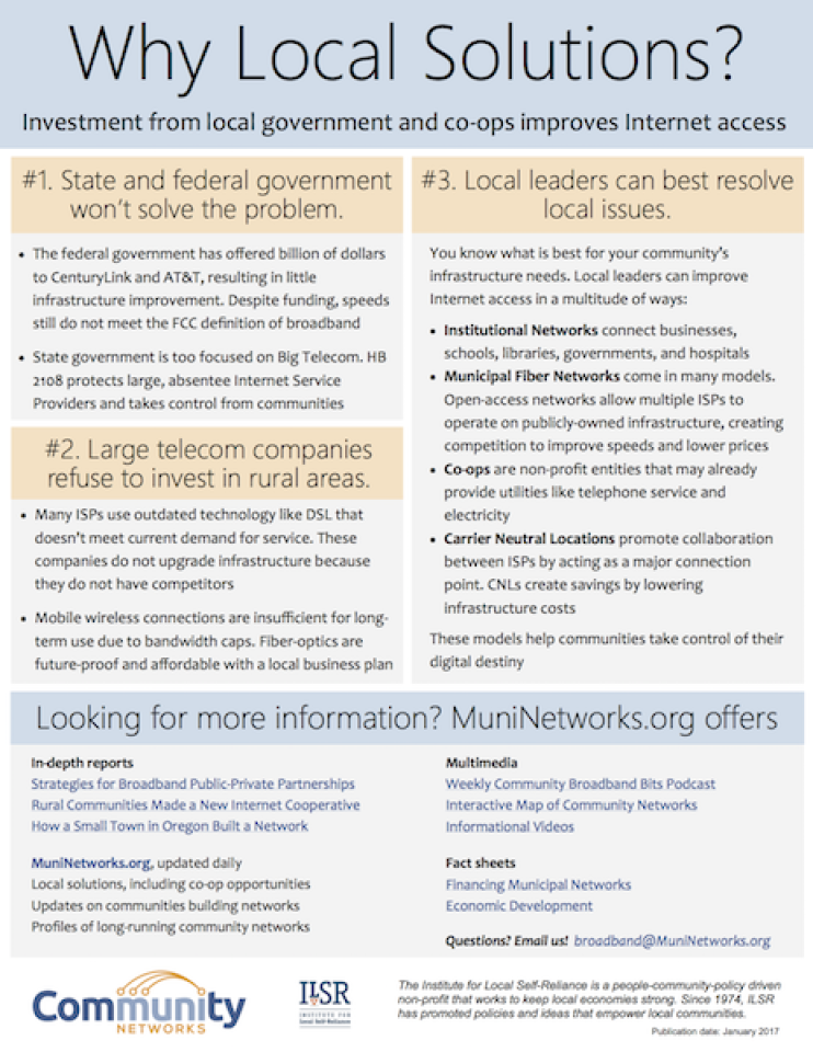 The next time you’re attending a city council meeting, a local broadband initiative, or just chatting with neighbors about better local connectivity, take a few copies of our fact sheet. In addition to providing some basic talking points to get the conversation moving, the fact sheet offers resources to guide you to more detailed information on publicly owned Internet networks. You've already started to get people interested in all the advantages of high-quality connectivity, now show them how local self-reliance it the most direct route to better access.