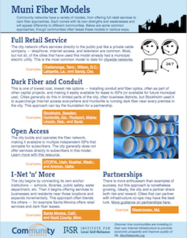 When you think “municipal fiber network,” you may think Chattanooga or Wilson, North Carolina - places where the city utility offers retail services directly to subscribers. That’s only one of several possible models that are emerging as an increasing number of communities use publicly owned assets to improve local connectivity. This fact sheet offers five of the most well known models that local governments are investigating and implementing as they become more self-reliant. Examples and characteristics of each model help illustrate.