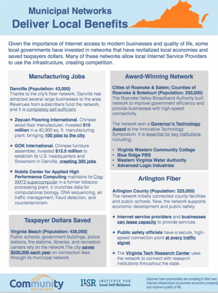 This fact sheet on municipal networks in Virginia describes how economic development, public savings, and better connectivity have contributed to the health of local communities with publicly owned networks. Virginia local governments have improved public safety, healthcare, and connectivity in local schools. Rural areas are better able to compete for high-tech and manufacturing jobs because high-speed connectivity is now an essential service for day-to-day business.