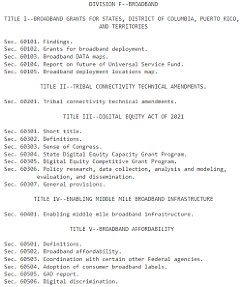While we have not yet gone through the final version with a fine-toothed comb, the broadband portion of the infrastructure bill appears to be identical to what was in the bipartisan Senate version of the bill, which we previously wrote about here.